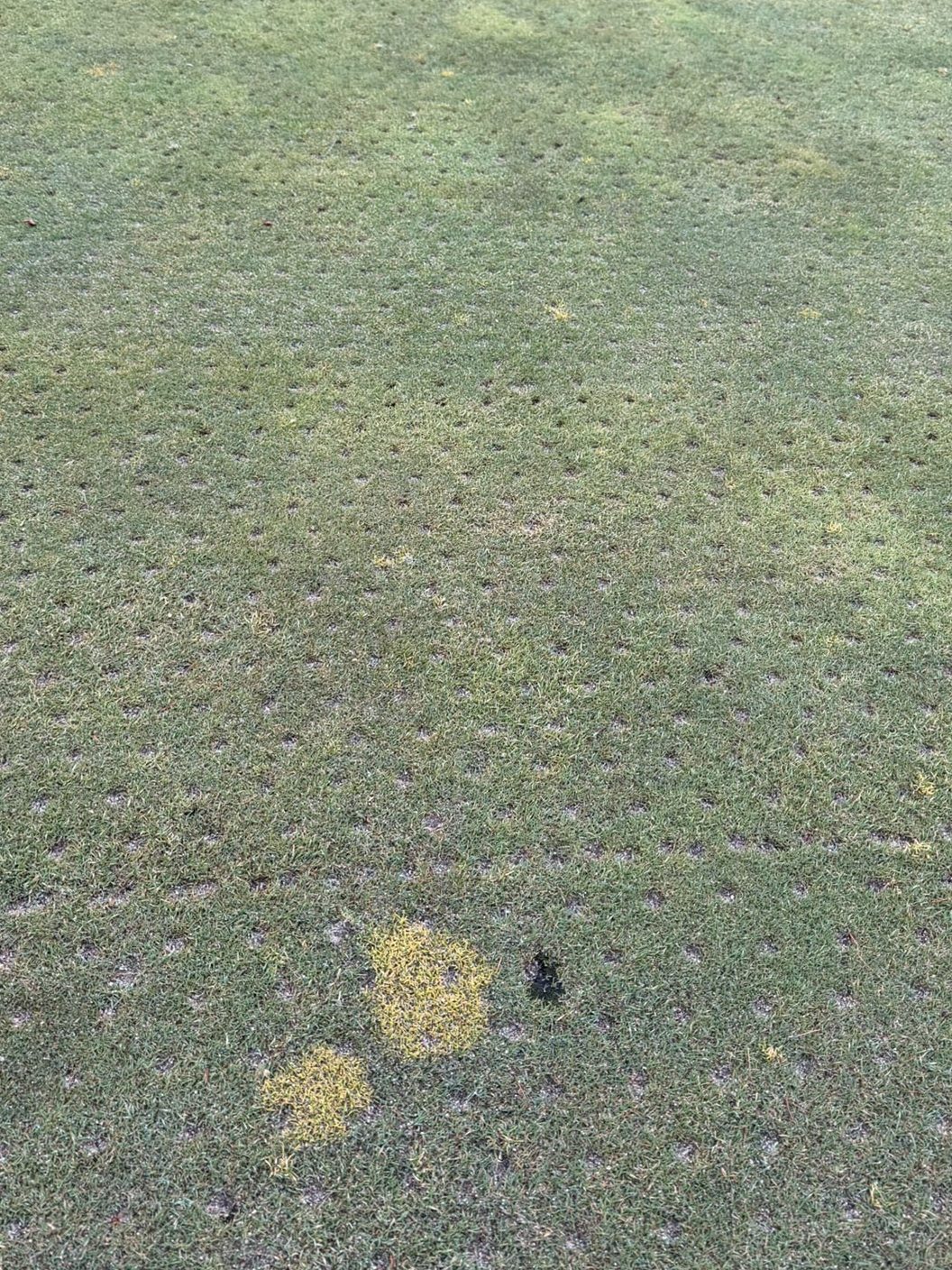 One benefit to freeze thaw/cycles is that they are devastating to Poa Annua, the weed turf grass that can take over putting surfaces. We spend quite a few dollars a year spraying products to limit the growth of Poa and mother nature just gave a huge lift. Here’s a patch on number 1.